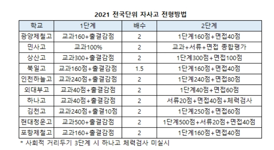 지난해 전국자사고 10개교의 정원내 경쟁률은 1.58대1을 기록했다. 2659명 모집에 4191명이 지원한 결과다. 최고경쟁률은 하나고였다. 하나고는 200명 모집에 478명이 지원하며 2.39대1의 경쟁률을 기록했다. 서울 강북 맨 위쪽 지역에 자리한 하나고는 선택형 교과수업과 탄탄한 교내 프로그램을 바탕으로 대입에서 독보적인 수시 실적을 기록해 왔다. 가장 최근인 2020입시에서 56명의 서울대 등록실적을 기록, 이 중 무려 50명의 학생을 수시를 통해 배출하며 명실상부한 '최강 수시체제' 고교임을 입증했다. 다음으로 외대부고가 350명을 모집한 가운데 지원자 784명으로 2.24대1의 경쟁률이다. 특히 지난해 1.79대1(250명/628명)에 머물렀던 외대부고 역시 지원자가 무려 156명이 늘면서 올해 하나고와 함께 2대1이상의 경쟁률을 기록해 눈길을 끌었다. 정시확대로 대입기조가 바뀐 것이 외대부고의 상승세를 이끌었다는 해석이 나온다. 수시/정시 가리지 않고 압도적인 대입실적을 내면서 ‘국내 정상급 고교’로 불리는 만큼 학교경쟁력이 입증됐기 때문이다.