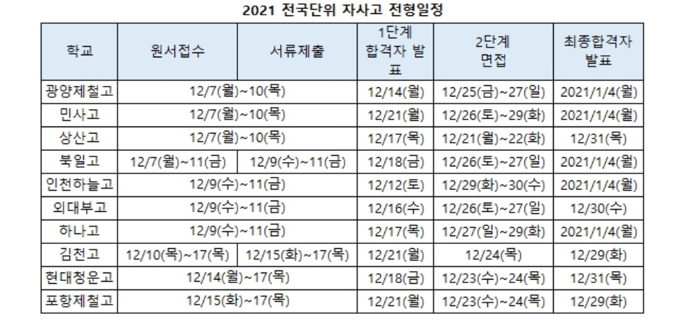원서접수는 민사고 상산고 광양제철고 북일고 현대청운고가 12월7일, 외대부고 인천하늘고 하나고가 12월9일 개막된다. 민사고 상산고 광양제철고는 12월10일, 북일고 외대부고 인천하늘고 하나고는 12월11일 원서접수가 종료된다. 현대청운고는 접수 마감일이 12월14일로 8일간 진행된다. 김천고 역시 12월10일부터 12월17일까지 원서접수를 진행, 접수기간이 상대적으로 길다는 특징이다. 포항제철고는 10개 전국자사고 중 원서접수 기간이 가장 늦다. 12월15일부터 12월17일까지 3일간 진행된다.
