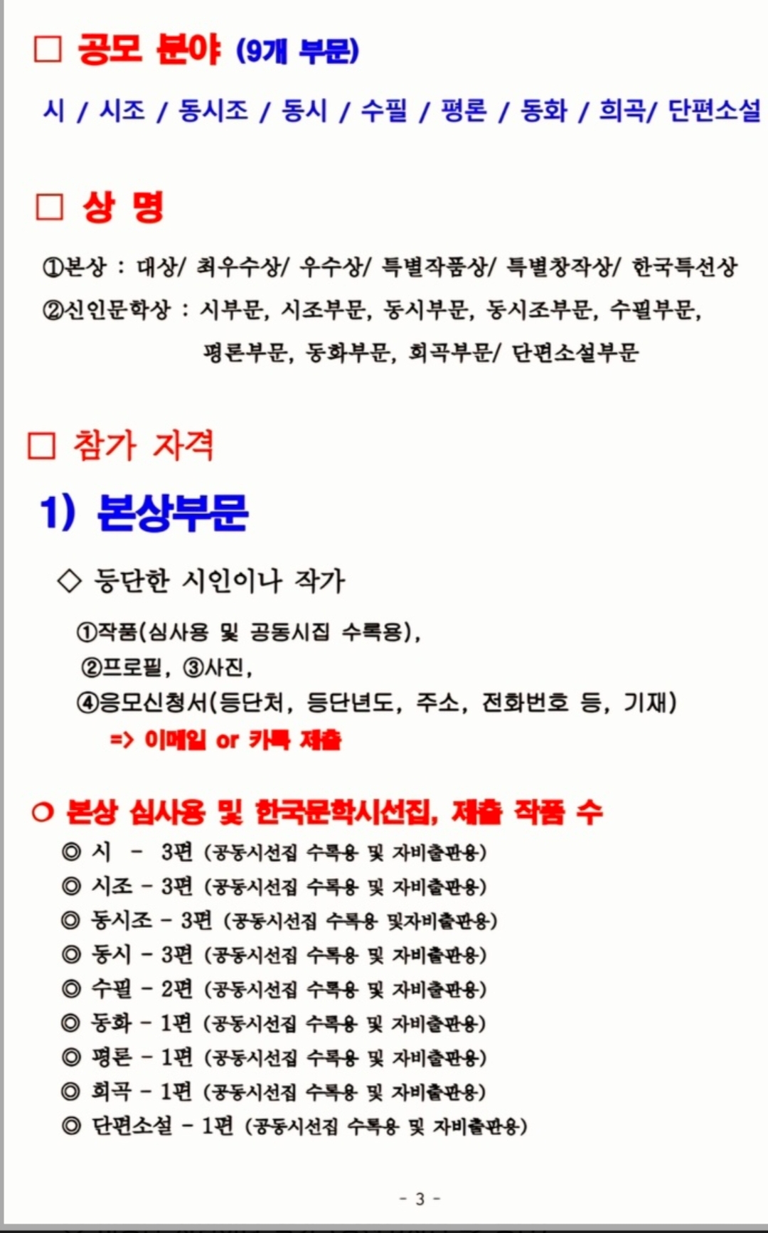 공모전 <시행공고문> 및 <아래사항>을 참조하시고 잘 숙지하셔서 <작품>, <프로필>과 <응모신청서(사진, 주소 등 기록)> 를 작성하여 <이메일> 또는 <카톡>으로 접수하시기 바랍니다.