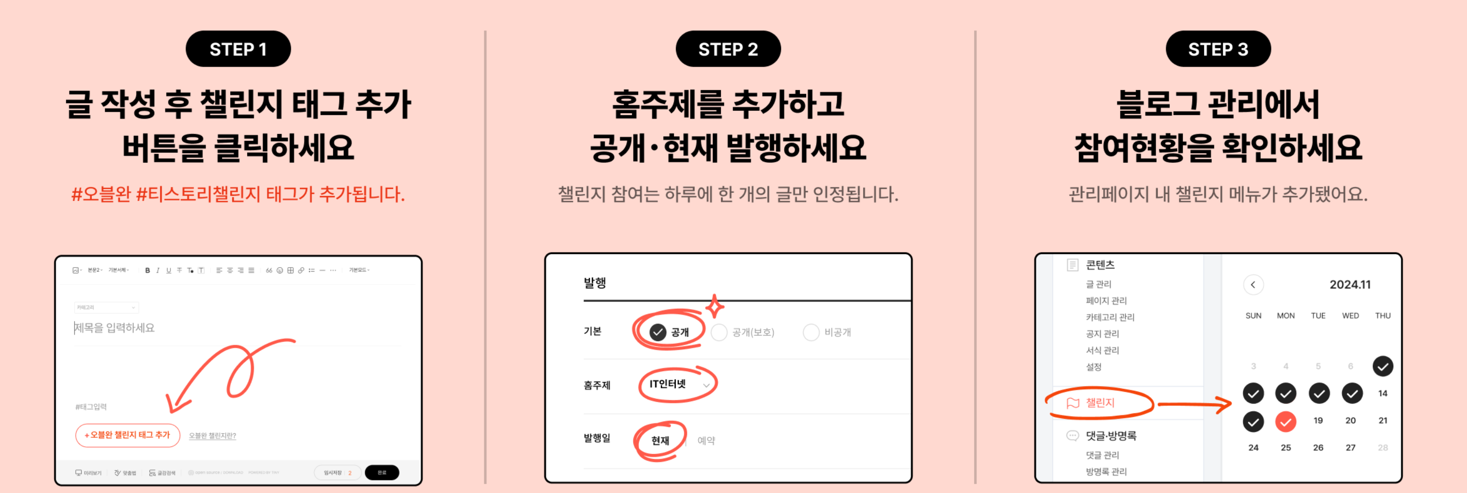 지금부터 ✏️ 참여방법과 챌린지를 성공적으로 완주할 수 있는 오블완 TIP✨을 소개해 드릴게요.