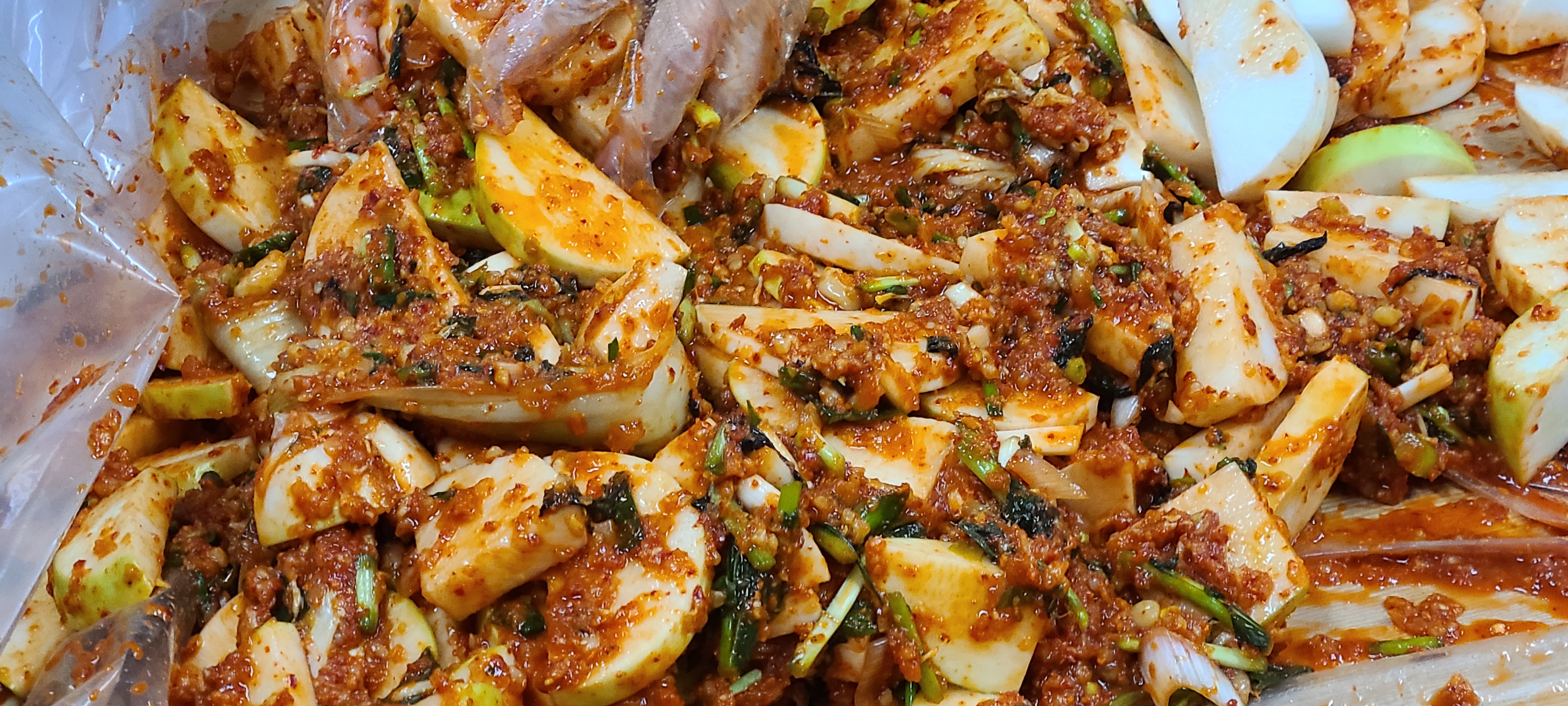 Add anchovy sauce, salted shrimp, salt, ground garlic, and seasoned radish and mix the basic seasoning.