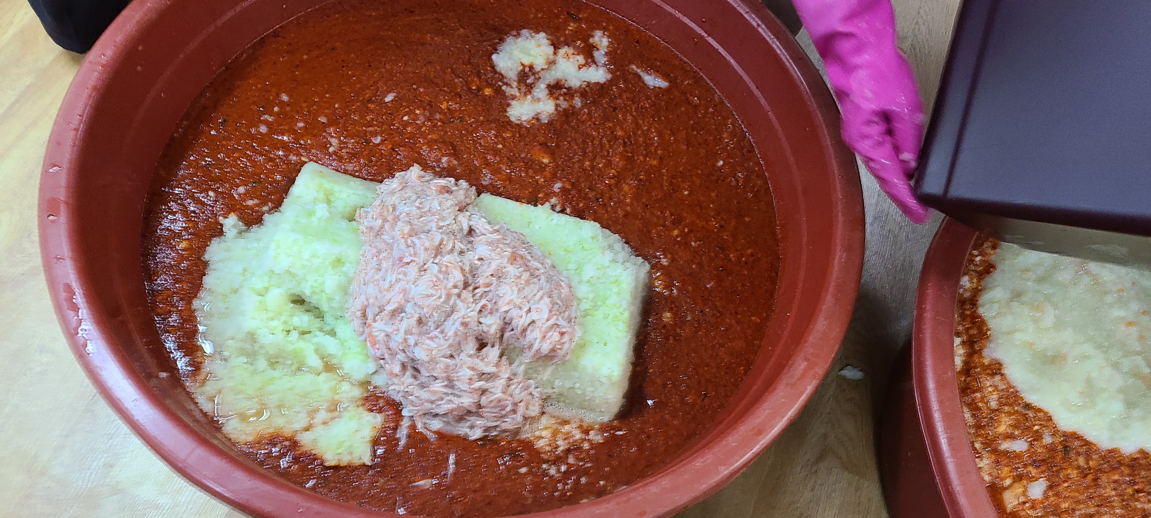Pour about 5kg of red pepper powder into a big basin