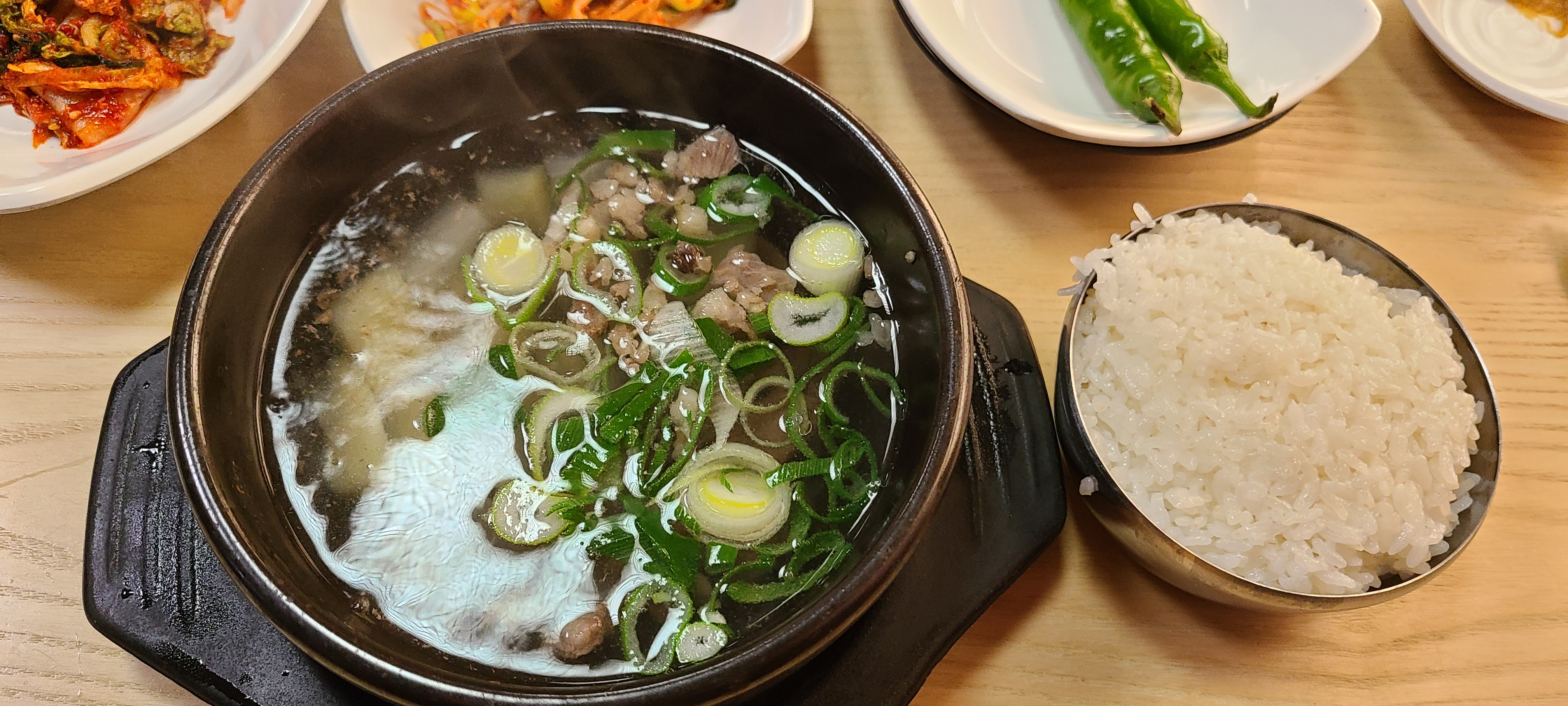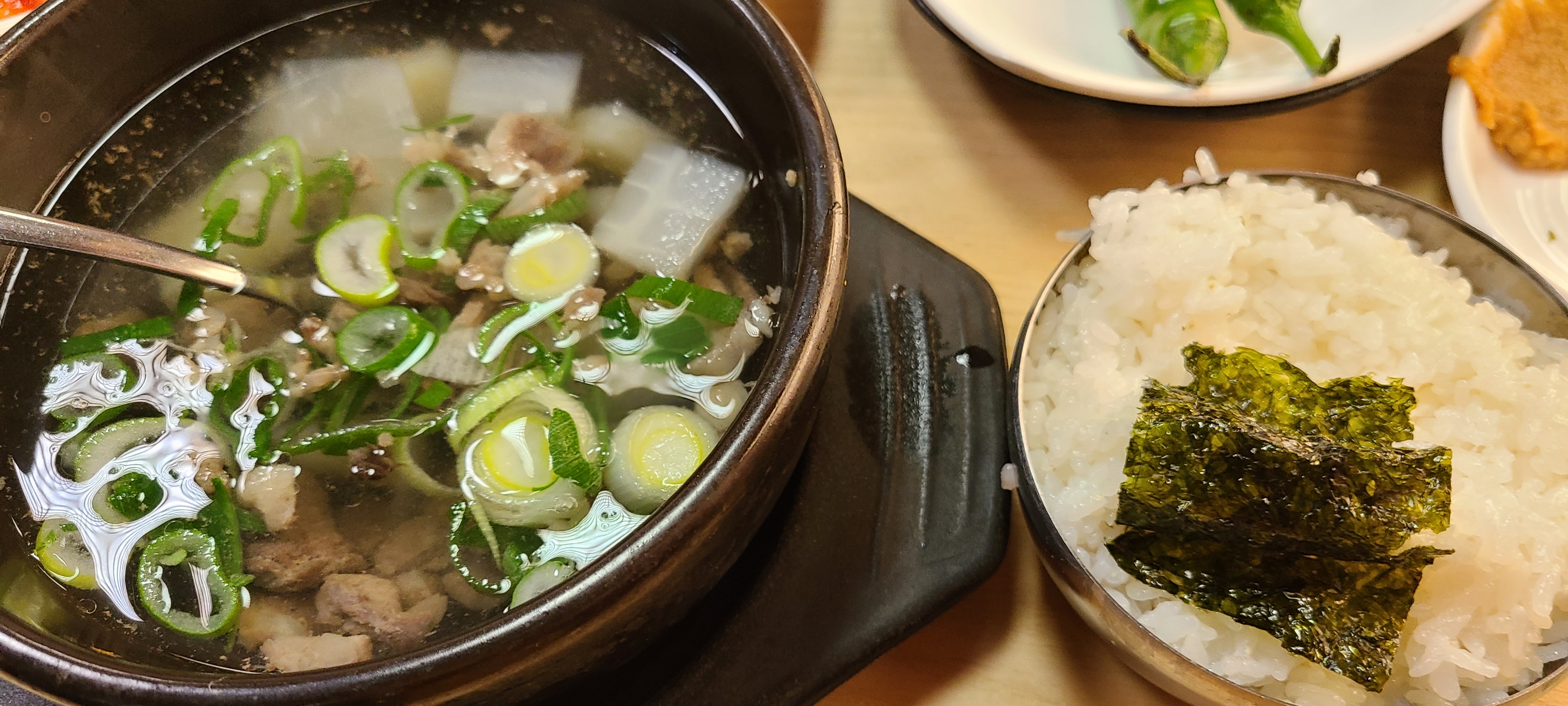 뚝배기가 매우 뜨거워 조심히 한 숟가락 후후 불어 한입 맛보았다.