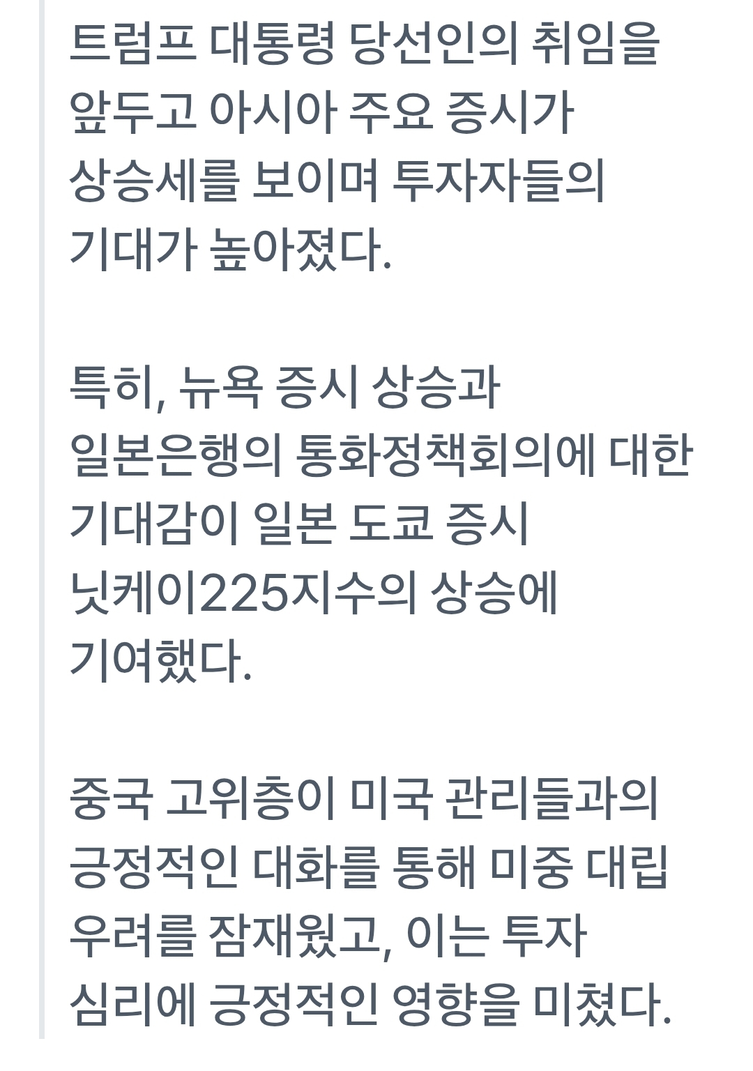 👩💻미국 증시의 : 트럼프의 취임 초기 미국 증시는 그의 경제 정책에 대한 불확실성으로 큰 변동성을 보였으나, 차후 트럼프의 감세안과 규제 완화 등의 정책이 시장에 긍정적인 영향을 미쳐 상승세를 이어갔습니다. 특히, 다우지수와 나스닥은 그의 정책 발표 후 강한 상승세를 보였습니다.