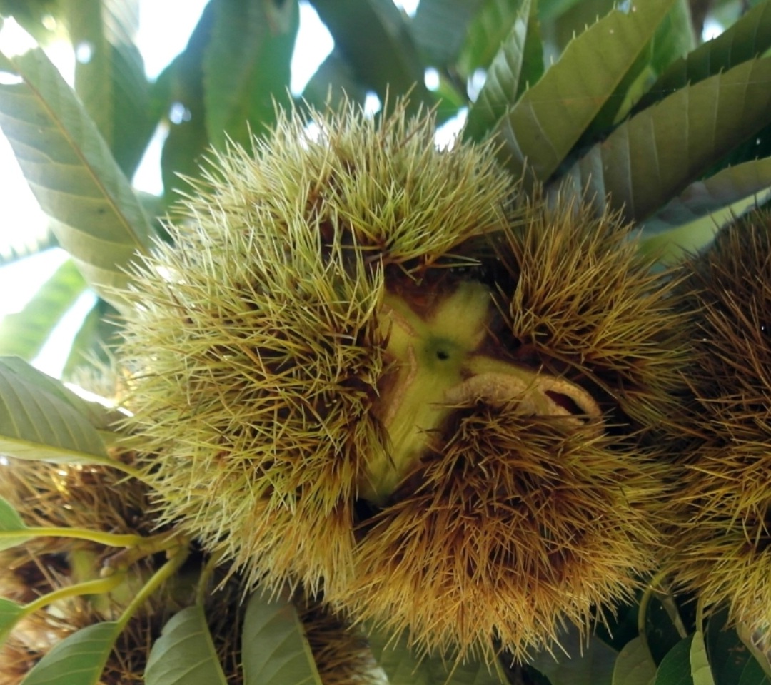 내가 토실토실 밤송이를 긴 장대에 매달고 왔다.