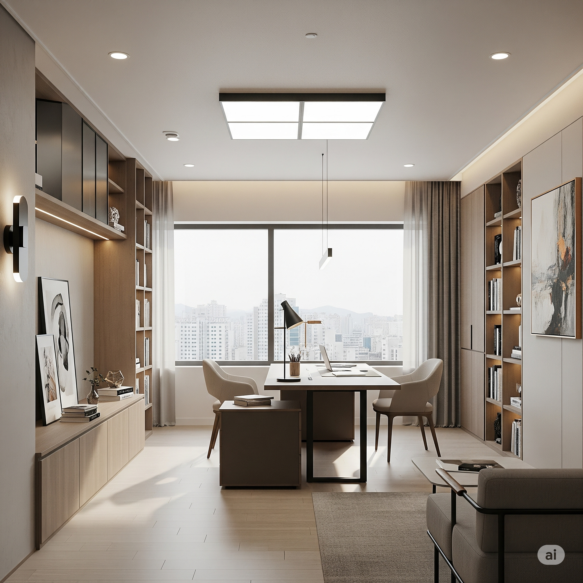 * 설치: 방 전체를 고르게 비추는 면 발광형 LED 평판등을 중앙에 설치합니다. 색온도는 **주백색(4000K~5000K)**으로 설정하여 깔끔하고 집중도 높은 분위기를 만듭니다. 눈부심을 줄이기 위해 조광(밝기 조절) 기능이 있는 제품을 선택하여 필요에 따라 조도를 조절할 수 있게 합니다.
