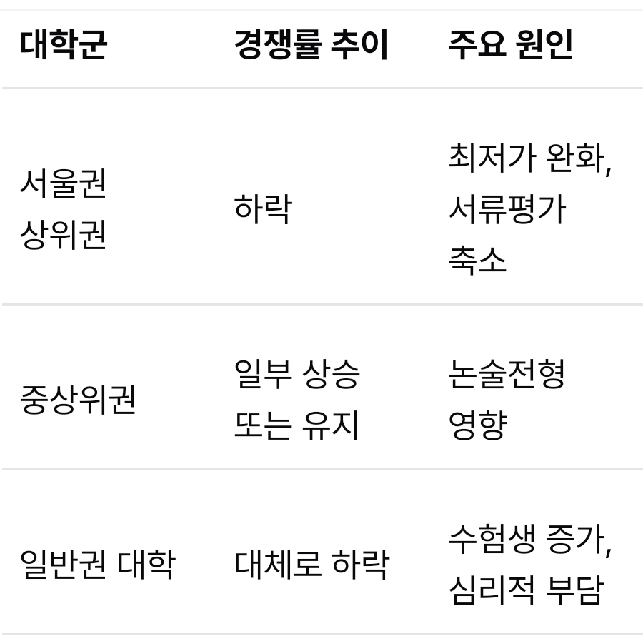 - 수험생 증가: 수험생 증가로 내신 커트라인 상승 우려가 있었으나, 오히려 경쟁률 하락으로 이어졌습니다
