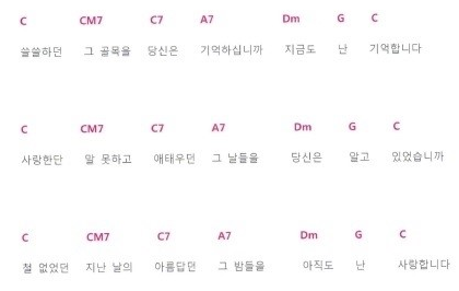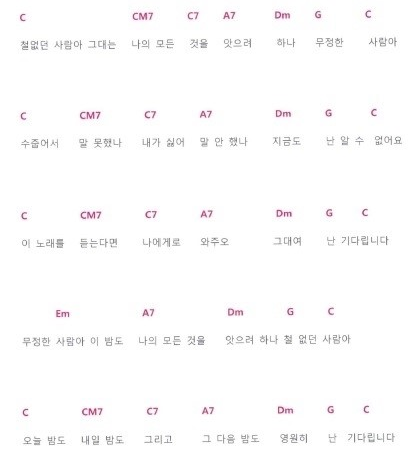 우쿠렐레/키타 코드 https://keywoomedu.tistory.com/79 잔나비 3:45 조덕배(가사포함):6:30 저작권 소유자 Recording Industry Association of Korea 위임자: RIAK